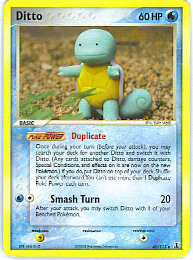 | Type | Water | | Pokemon serie | Delta Species | | Stadie | Basic | | HP | 60 | | Sjældenhed | Uncommon | | Tilbagetrækning | 1 | | Svaghed | L | | Kortnummer | 40 | | Evne | on it are now on the new Pokemon.) If you do, put Ditto on top of your deck. Shuffle your deck afterward. You can't use more than 1 Duplicate Poke-Power each turn. (Poke-POWER)