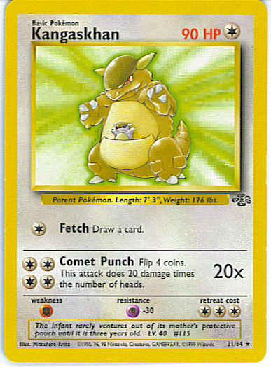 | Type | Colorless | | Pokemon serie | Jungle | | Stadie | Basic | | HP | 90 | | Sjældenhed | Rare | | Tilbagetrækning | 3 | | Modstand | P | | Svaghed | F | | Kortnummer | 21 | | Evne |