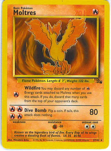 | Type | Fire | | Pokemon serie | Fossil | | Stadie | Basic | | HP | 70 | | Sjældenhed | Rare | | Tilbagetrækning | 2 | | Modstand | F | | Kortnummer | 27 | | Evne |