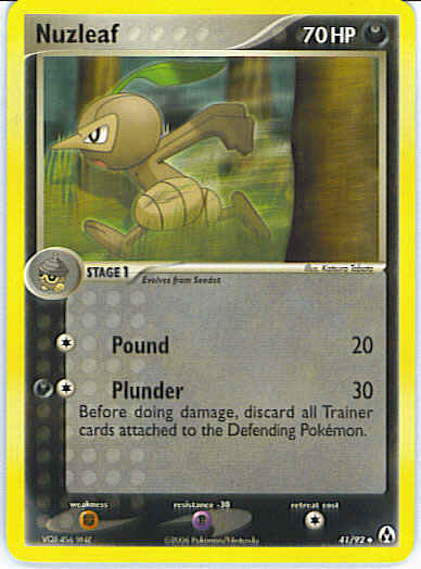 | Type | Darkness | | Pokemon serie | Legend Maker | | Stadie | Stage 1 | | HP | 70 | | Sjældenhed | Uncommon | | Tilbagetrækning | 1 | | Modstand | P | | Svaghed | F | | Kortnummer | 41 | | Evne | [C] Pound (20) [CD] Plunder (30) Before doing damage, discard all Trainer cards attached to the Defending Pokemon. | | Evne2 | [C] Pound (20) [CD] Plunder (30) Before doing damage, discard all Trainer cards attached to the Defending Pokemon. | | Kunstner | Katsura Tabata |