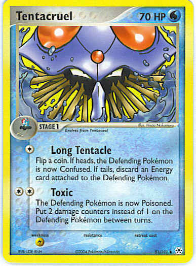 | Type | Water | | Pokemon serie | Hidden Legends | | Stadie | Stage 1 | | HP | 70 | | Sjældenhed | Uncommon | | Svaghed | L | | Kortnummer | 51 | | Evne | [C] Long Tentacle - Flip a coin. If heads, the Defending Pokemon is now Confused. If tails, discard an Energy card attached to the Defending Pokemon. [CC] Toxic - The Defending Pokemon is now Poisoned. Put 2 damage counters instead of 1 on the Defending Pokemon between turns. | | Evne2 | [C] Long Tentacle - Flip a coin. If heads, the Defending Pokemon is now Confused. If tails, discard an Energy card attached to the Defending Pokemon. [CC] Toxic - The Defending Pokemon is now Poisoned. Put 2 damage counters instead of 1 on the Defending Pokemon between turns. | | Kunstner | Hisao Nakamura |