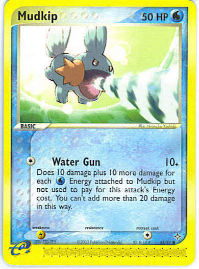 Evne[C] Water Gun (10+) Does 10 damage for each W Energy attached to Mudkip but not used to pay for this attack's Energy cost. You can't add more than 20 damage in this way.
