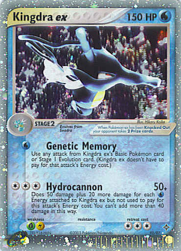 | Evne | [W] Genetic Memory - Use any attack from Kingdra ex's Basic Pokemon card or Stage 1 Evolution card. (Kingdra ex doesn't have to pay for that attack's Energy cost.) [CCC] Hydrocannon (50+) Does 50 damage plus 20 more damage for each W Energy attached to Kingdra ex but not used to pay for this attack's Energy cost. You can't add more than 40 damage in this way. |