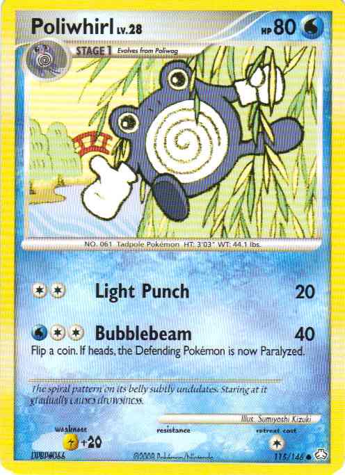 | Type | Water | | Pokemon serie | Legends Awakened | | Stadie | Stage 1 | | HP | 80.0 | | Sjældenhed | Common | | Tilbagetrækning | 1.0 | | Svaghed | L+20 | | Kortnummer | 115 | | Evne |
