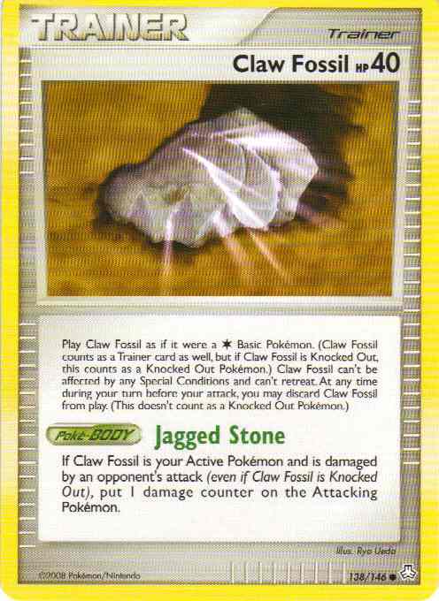 Evne Play Claw Fossil as if it were a Basic Pokemon. (Claw Fossil counts as a Trainer card as well, but if Claw Fossil is Knocked Out, this counts as a Knocked Out Pokemon.) Claw Fossil can't be affected by any Special Conditions and can't retreat. At any time during your turn before your attack, you may discard Claw Fossil from play. (This doesn't count as a Knocked Out Pokemon.)