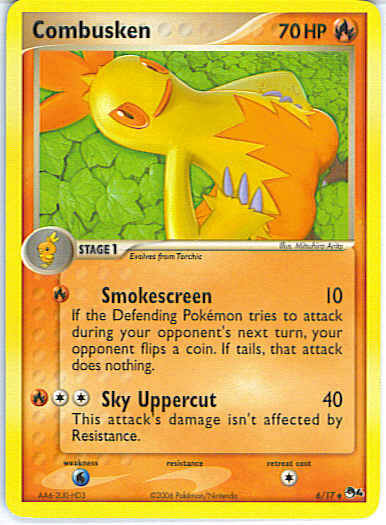 | Type | Fire | | Pokemon serie | OP Series 4 | | Stadie | Stage 1 | | HP | 70 | | Sjældenhed | Uncommon | | Tilbagetrækning | 1 | | Svaghed | W | | Kortnummer | 6 | | Evne | [R] Smokescreen (10) If the Defending Pokemon tries to attack during your opponent's next turn, your opponent flips a coin. If tails, that attack does nothing. [CCR] Sky Uppercut (40) This attack's damage isn't affected by Resistance.
