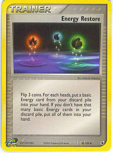 Evne Flip 3 coins. For each heads, put a basic Energy card from your discard pile into your hand. If you don't have that many basic Energy cards in your discard pile, put all of them into your hand.