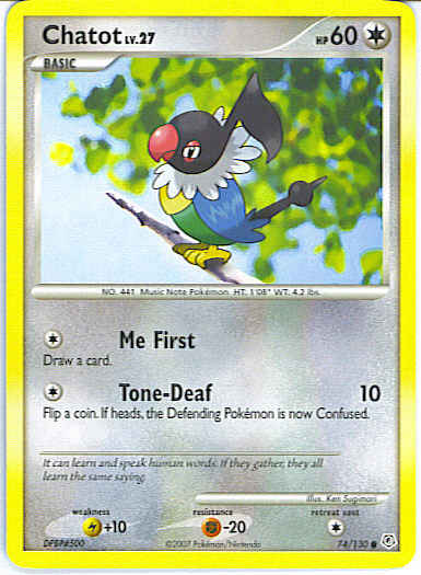 | Type | Colorless | | Pokemon serie | Diamond and Pearl | | Stadie | Basic | | HP | 60 | | Sjældenhed | Common | | Tilbagetrækning | 1 | | Modstand | F-20 | | Svaghed | L+10 | | Kortnummer | 74 | | Evne |