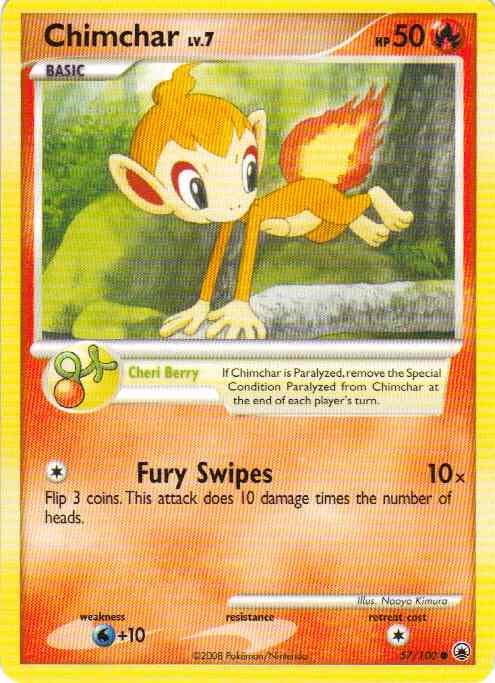 | Type | Fire | | Pokemon serie | Majestic Dawn | | Stadie | Basic | | HP | 50.0 | | Sjældenhed | Common | | Tilbagetrækning | 1.0 | | Svaghed | W+10 | | Kortnummer | 57 | | Evne | [C] Fury Swipes (10x) Flip 3 coins. This attack does 10 damage times the number of heads.