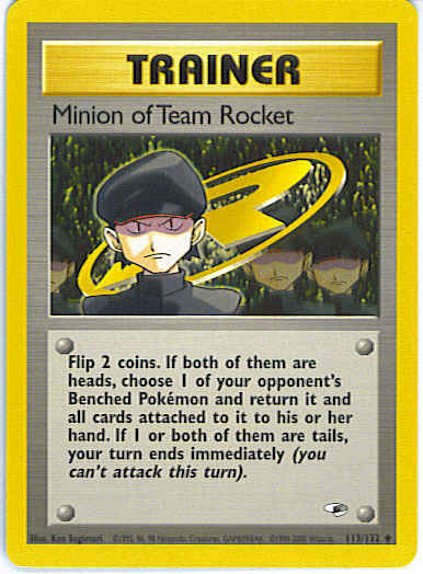 Evne Flip 2 coins. If both of them are heads, choose 1 of your opponent's Benched Pokemon and return it and all cards attached to it to his or her hand. If 1 or both of them are tails, your turn ends immediately (you can't attack this turn).