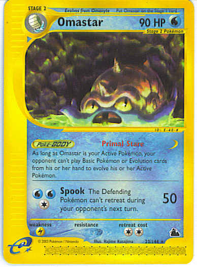| Type | Water | | Pokemon serie | Skyridge | | Stadie | Stage 2 | | HP | 90 | | Sjældenhed | Rare | | Tilbagetrækning | 2 | | Svaghed | L | | Kortnummer | 23 | | Evne | [CWW] Spook (50) The Defending Pokemon can't retreat during your opponent's next turn.