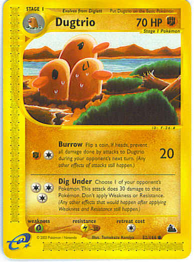 Evne2[CF] Burrow (20) Flip a coin. If heads, prevent all damage done by attacks to Dugtrio during your opponent's next turn. (any other effects of attacks still happen.)