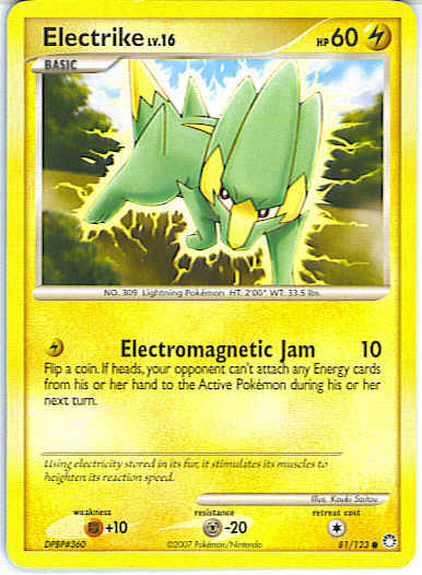 | Type | Lightning | | Pokemon serie | Mysterious Treasures | | Stadie | Basic | | HP | 60 | | Sjældenhed | Common | | Tilbagetrækning | 1 | | Modstand | M-20 | | Svaghed | F+10 | | Kortnummer | 81 | | Evne |