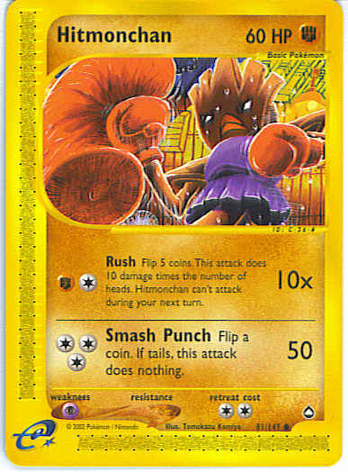 | Type | Fighting | | Pokemon serie | Aquapolis | | Stadie | Basic | | HP | 60 | | Sjældenhed | Common | | Tilbagetrækning | 2 | | Svaghed | P | | Kortnummer | 81 | | Evne | [CF] Rush (10x) Flip 5 coins. This attack does 10 damage times the number of heads. Hitmonchan can't attack during your next turn. [CCC] Smash Punch (50) Flip a coin. If tails, this attack does nothing.