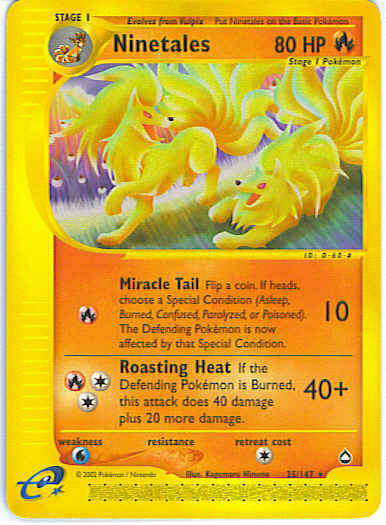 | Type | Fire | | Pokemon serie | Aquapolis | | Stadie | Stage 1 | | HP | 80 | | Sjældenhed | Rare | | Tilbagetrækning | 1 | | Svaghed | W | | Kortnummer | 25 | | Evne | [R] Miracle Tail (10) Flip a coin. If heads, choose 1 Special Condition. The Defending is now affected by that Special Condition. [CCR] Roasting Heat (40+) If the Defending Pokemon is Burned, this attack does 40 damage plus 20 more damage.