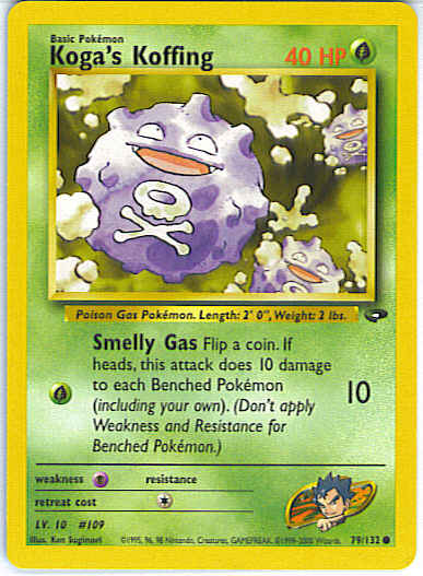 [G] Smelly Gas (10) Flip a coin. If heads, this attack does 10 damage to each Benched Pokemon (including your own). (Don't apply Weakness and Resistance for Benched Pokemon.)