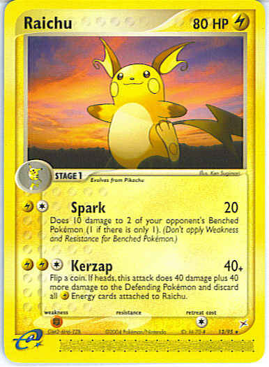 | Type | Lightning | | Pokemon serie | Team Aqua-Team Magma | | Stadie | Stage 1 | | HP | 80 | | Sjældenhed | Rare | | Tilbagetrækning | 1 | | Svaghed | F | | Kortnummer | 13 | | Evne | [CL] Spark (20) Does 10 damage to 2 of your opponent's Benched Pokemon (1 if there is only 1). (Don't apply Weakness and Resistance for Benched Pokemon.) [CLL] Kerzap (40+) Flip a coin. If heads, this attack does 40 damage plus 40 more damage to the Defending Pokemon and discard all L Energy cards attached to Raichu.