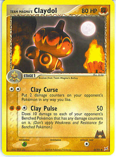 | Type | Fighting | | Pokemon serie | Team Aqua-Team Magma | | Stadie | Stage 1 | | HP | 80 | | Sjældenhed | Uncommon | | Tilbagetrækning | 1 | | Svaghed | G | | Kortnummer | 33 | | Evne | [CC] Clay Curse - Put 2 damage counters on your opponent's Pokemon in any way you like. [CFF] Clay Pulse (50) Does 10 damage to each of your opponent's Benched Pokemon that has any damage counters on it. (Don't apply Weakness and Resistance for Benched Pokemon.)