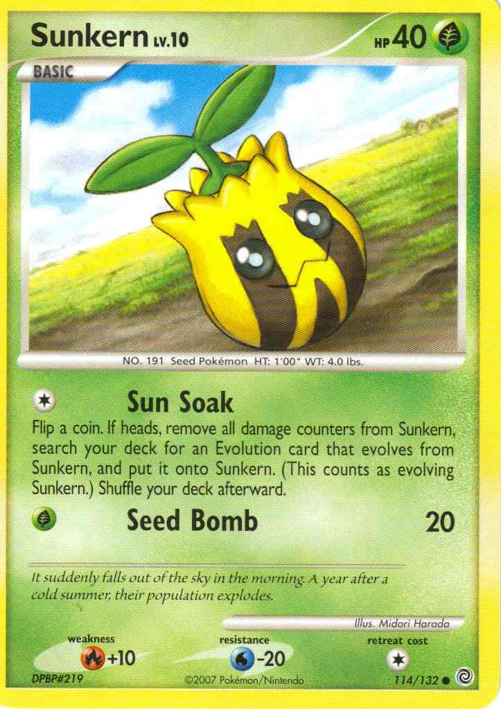 Evne2 [C] Sun Soak - Flip a coin. If heads, remove all damage counters from Sunkern, search your deck for an Evolution card that evolves from Sunkern, and put it onto Sunkern. (This counts as evolving Sunkern.) Shuffle your deck afterward.