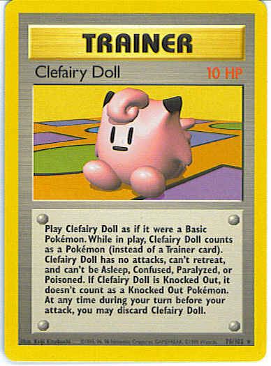 Play Clefairy Doll as if it were a Basic Pokemon. While in play, Clefairy Doll counts as a Pokemon (instead of a Trainer card.) Clefairy Doll has no attacks, can't retreat, and can't be Asleep, Confused, Paralyzed, or Poisoned. If Clefairy Doll is K-O'd, it doesn't count as a K-O. At any time during your turn (before attack), you may discard Clefairy Doll.