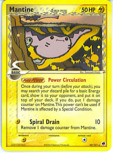 | Type | Lightning | | Pokemon serie | Dragon Frontiers | | Stadie | Basic | | HP | 50 | | Sjældenhed | Rare | | Tilbagetrækning | 1 | | Svaghed | L | | Kortnummer | 20 | | Evne | [L] Spiral Drain (10) Remove 1 damage counter from Mantine.