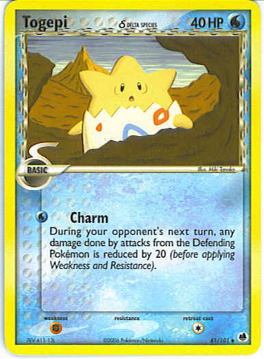 Evne2[W] Charm - During your opponent's next turn, any damage done by attacks from the Defending Pokemon is reduced by 20 (before applying Weakness and Resistance).