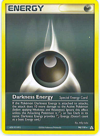 If the Pokemon Darkness Energy is attached to attacks, the attack does 10 more damage to the Active Pokemon (before applying Weakness and Resistance). Ignore this effect unless the Attacking Pokemon is D or has Dark in its name. Darkness Energy provides D
