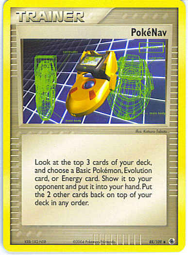 | Type | Trainer | | Pokemon serie | Ruby Sapphire | | Stadie | Trainer | | Sjældenhed | Uncommon | | Kortnummer | 88 | | Evne | Look at the top 3 cards of your deck, and choose a Basic Pokemon, Evolution, or Energy Card. Show it to your opponent and put it into your hand. Put the 2 other cards back on top of your deck in any order.
